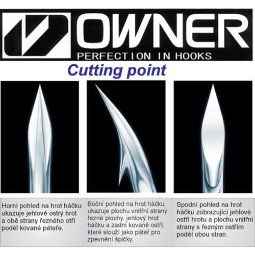 Ostří Cutting Point - je revoluční a patentovaný design ostří od firmy Owner. Tento trojhranný hrot ve tvaru kopí, snižuje odpor při pronikání rybí tlamkou a okamžitě zajistí úspěšný záběr. Háčky s Cutting Point hrotem jsou ideální pro různé druhy rybářských technik.