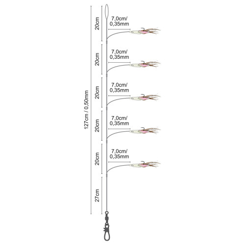 Měkké hokkai imitace s přirozeným pohybem ve vodě dokonale napodobují drobné hlavonožce a malé rybky. Návazec je osazen háčky velikosti 1/0 a vyroben z kvalitního monofilu v kombinaci 0,50 / 0,35 mm, což zaručuje vysokou pevnost a odolnost proti oděru při kontaktu s kamenitým dnem nebo velkými rybami.
