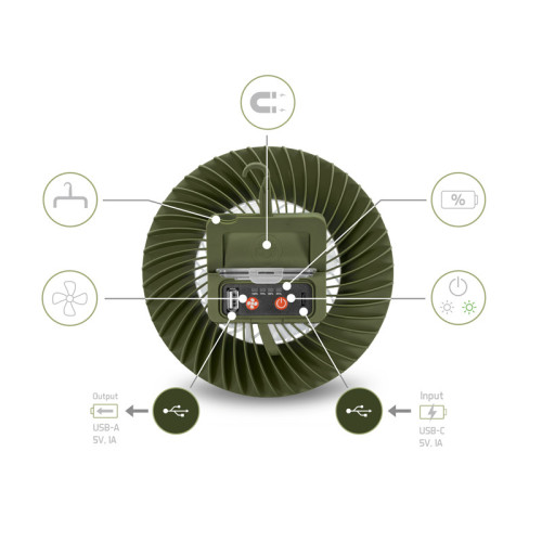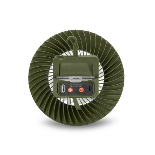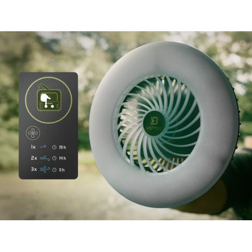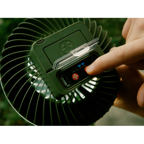 Stejně jako osvětlení, i ventilátor nabízí tři režimy intenzity, díky čemuž si jej jednoduše přizpůsobíte podle aktuálních teplotních podmínek. Prvním stisknutím se spustí ventilátor na nízkou intenzitu, při které baterie vydrží až 19 hodin. Druhý stisk zvýší výkon ventilátoru, přičemž výdrž se zkrátí na přibližně 14 hodin. Při nejvyšší intenzitě, aktivované třetím stiskem, ventilátor vydrží pracovat přibližně 11 hodin.